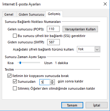 Gelişmiş ayarlar içerisinde mailin sunucudan kaç gün sonra silinmesini istediğinize dair bir ayar bulunmkatadır.Tavsiye edilen maili sürenin kısa tutulmasıdır.Bu sayede mailleriniz mail kotanızı doldurmaz.
